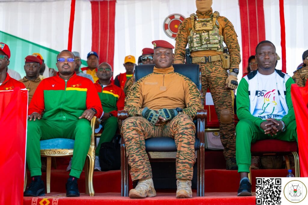 (Ouagadougou, 2 novembre 2025). Le Président du Faso, Chef de l’État, le Capitaine Ibrahim Traoré, assiste, ce dimanche sur le boulevard Thomas Sankara, à la dernière étape de la 36e édition du Tour cycliste international du Faso.
