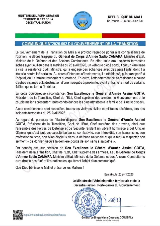 Les autorités maliennes ont annoncé dans un communiqué ce dimanche soir la mort du général Sadio Camara, ministre de la Défense, lors des attaques terroristes survenues hier samedi 25 avril 2026.