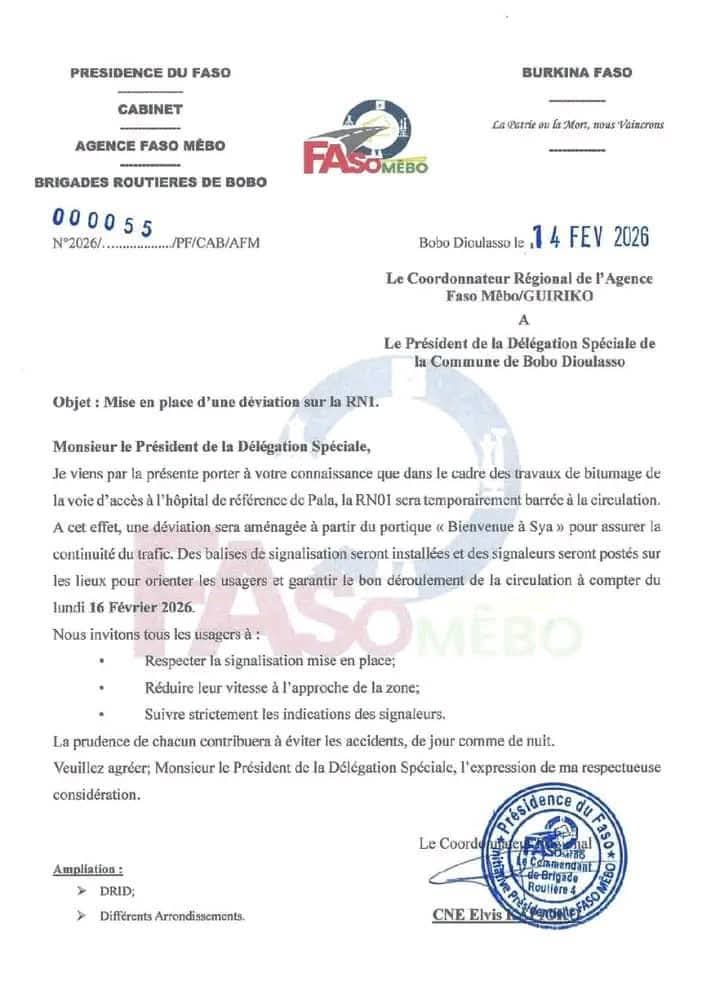 Les usagers de la route nationale n°1 sont invités à emprunter une déviation dès ce lundi 16 février 2026 à l’entrée de Bobo-Dioulasso, dans le cadre du bitumage de la voie d’accès à l’hôpital de référence de Pala.