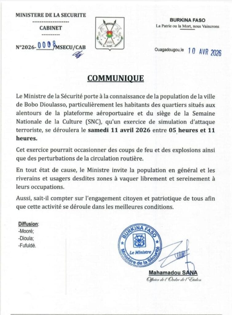 Le ministère de la Sécurité, Mahamadou Sana, annonce un exercice de simulation d’attaque terroriste à Bobo-Dioulasso, le samedi 11 avril 2026, entre 05H00 et 11H00, dans un communiqué qui indique que l’évènement aura lieu non loin du siège de la Semaine nationale de la Culture (SNC).