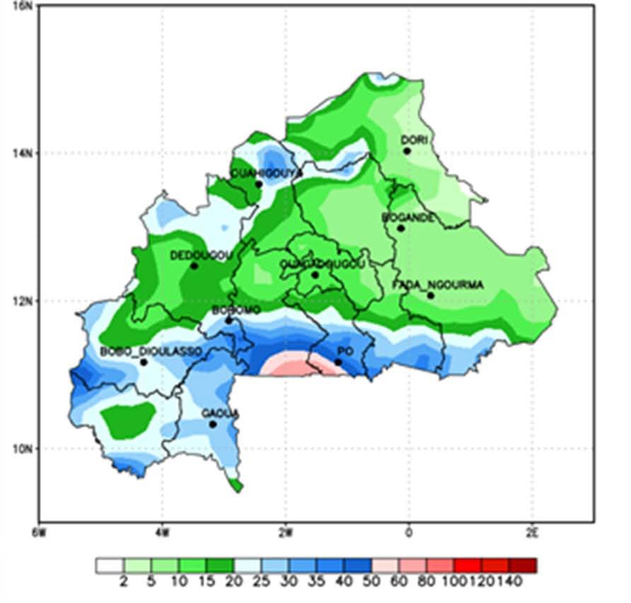 Les cumuls pluviométriques hebdomadaires seront « faibles sur la majeure partie du pays bien que >50 mm possibles dans le sud des régions du Nando et Nazinon ».