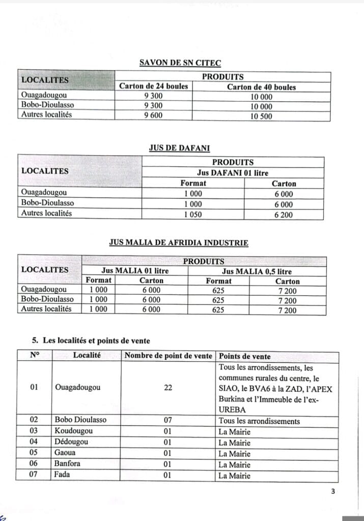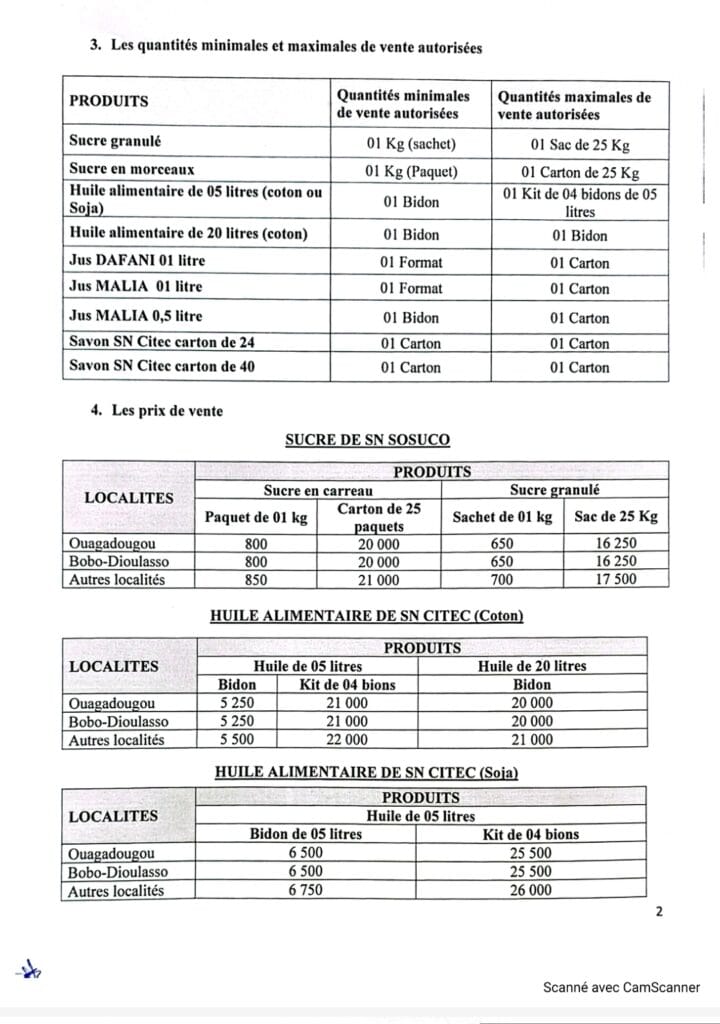 Les produits concernés par la présente opération spéciale de vente sont : sucre granulé (SN SOSUCO); sucre en morceaux (SN SOSUCO); huile de soja et de coton (SN Citec) 5 litres ; huile de coton (SN Citec) 20 litres ; juste Daphani ; jus Malia et savon SN Citec.