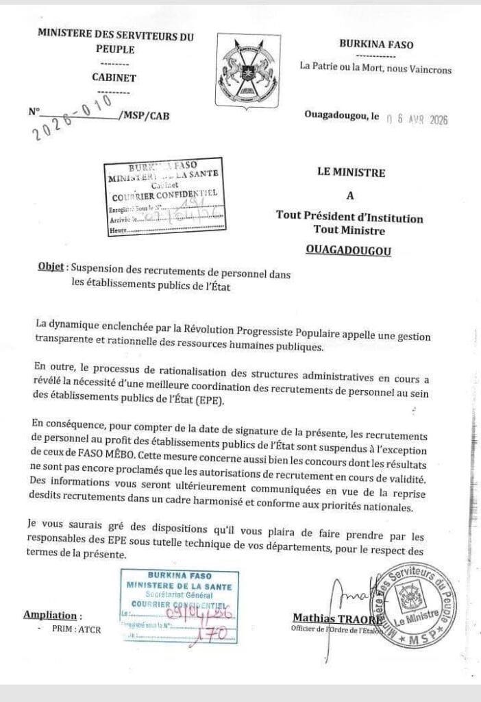Le gouvernement burkinabè a suspendu, dans une circulaire datée du 06 avril 2026, tous les recrutements de personnel dans les Établissements publics de l’État (EPE).