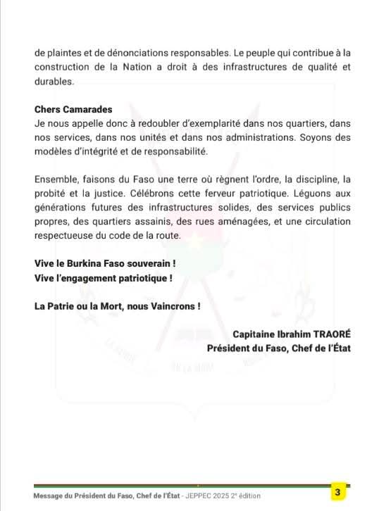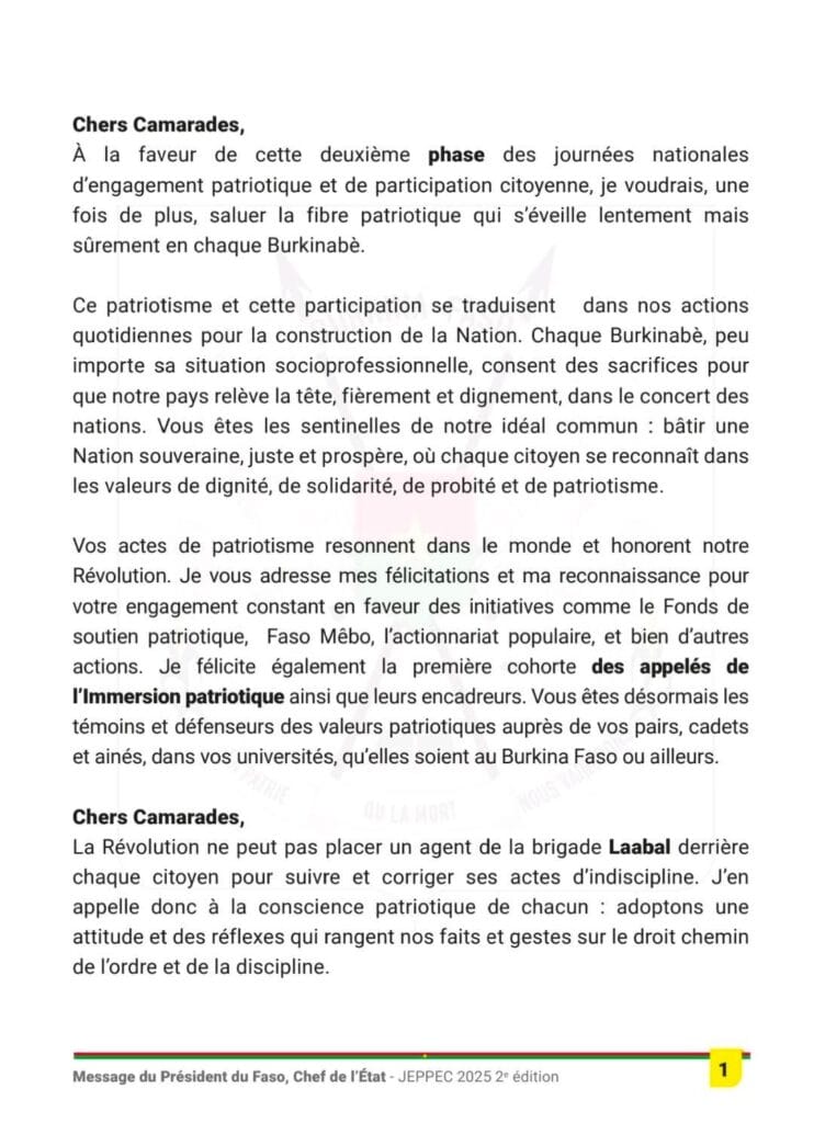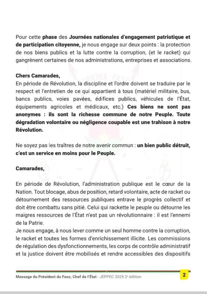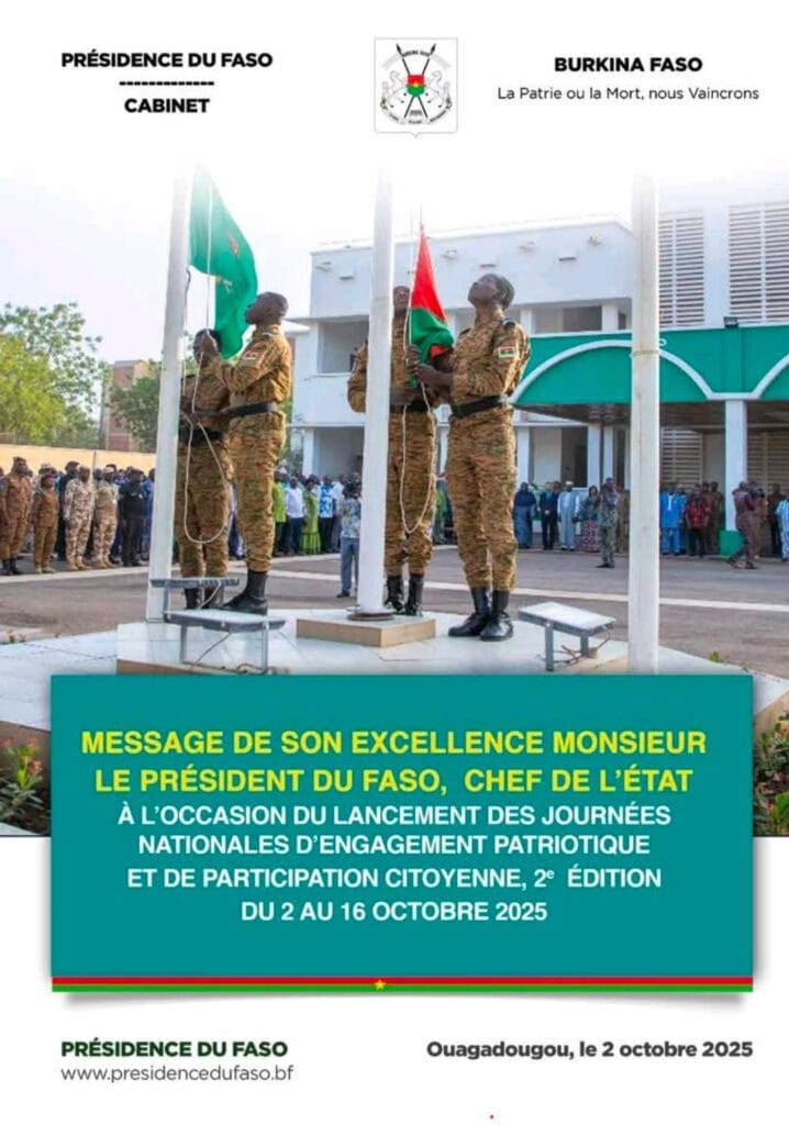 Ceci est le message du capitaine Ibrahim Traoré, président du Faso, chef de l’État, a l’occasion de la 2e édition des Journées d’engagement patriotique et de participation citoyenne.