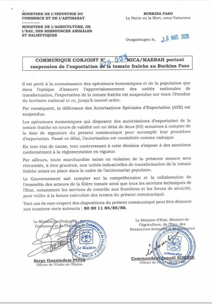 L’exportation de la tomate fraîche est suspendue jusqu’à nouvel ordre sur toute l’étendue du territoire burkinabè, selon un communiqué conjoint du ministère du Commerce et celui de l’Agriculture, ce lundi 16 mars 2026.