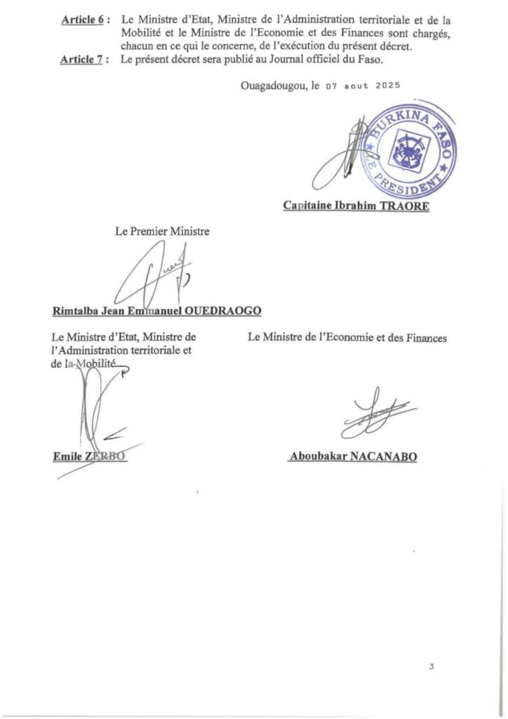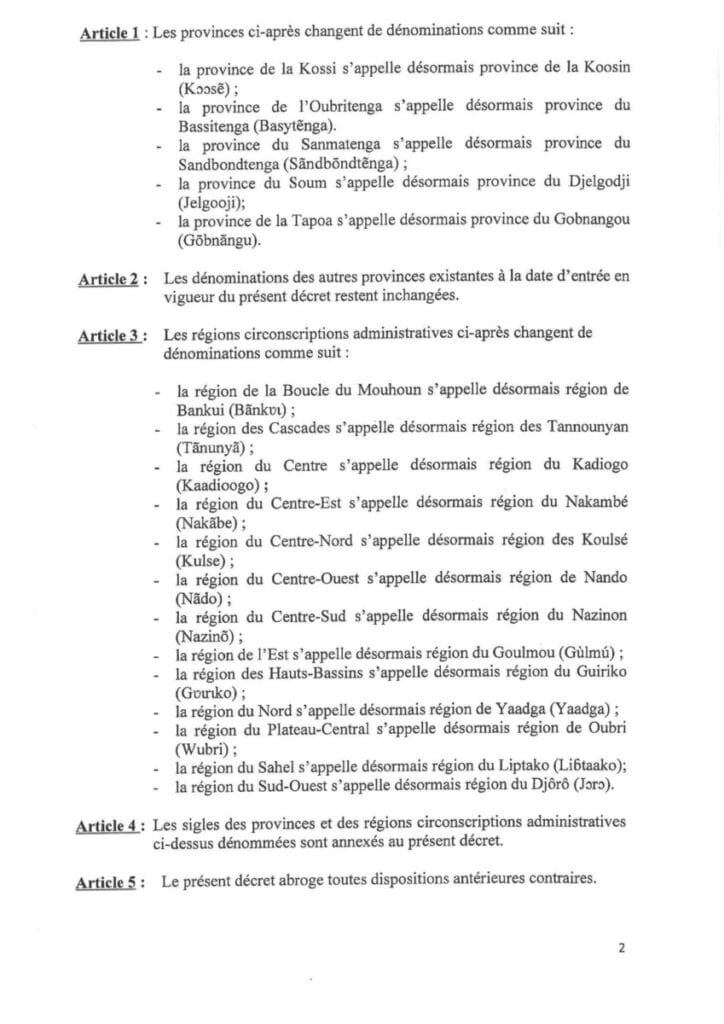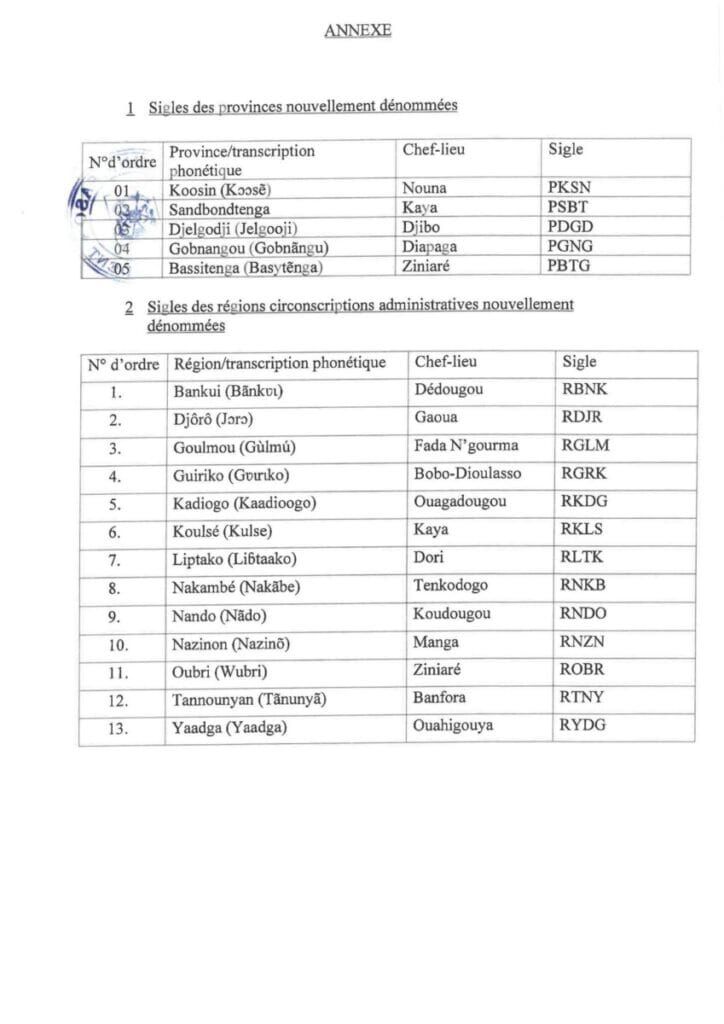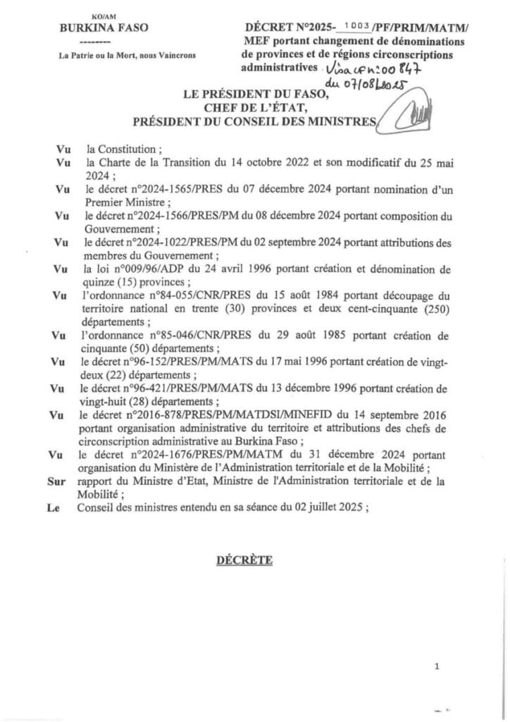 DÉCRET N°2025-1003/PF/PRIM/MATM/MEF portant changement de dénominations de provinces et de régions, circonscriptions administratives.