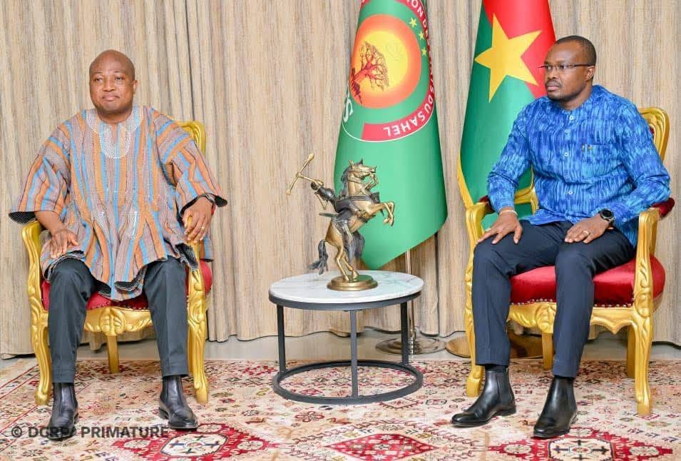 Le Premier ministre, Rimtalba Jean Emmanuel Ouédraogo, a accordé une audience à une délégation de la République du Ghana conduite par son ministre des Affaires étrangères, S.E.M. Samuel Okudzeto Ablakwa. La délégation incluant l’envoyé spécial du Ghana pour l’AES a été introduite auprès du Chef du Gouvernement par le ministre burkinabè en charge des Affaires étrangères, S.E.M. Karamoko Jean Marie Traoré. Les échanges ont porté sur le renforcement de la coopération bilatérale, à la faveur de la 13ᵉ session de la Grande Commission mixte de coopération, cadre privilégié de concertation et de suivi des engagements communs.