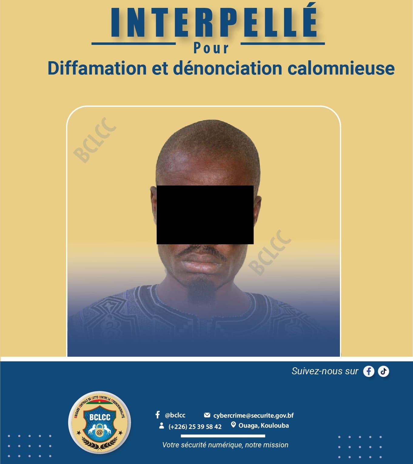 Dans le cadre de sa mission de protection des personnes et de leurs biens dans le cyberespace burkinabè, la Brigade Centrale de Lutte Contre la Cybercriminalité (BCLCC) a interpellé un présumé auteur sde diffamation et de dénonciation calomnieuse commis par le biais des Technologies de l’Information et de la Communication (TIC).