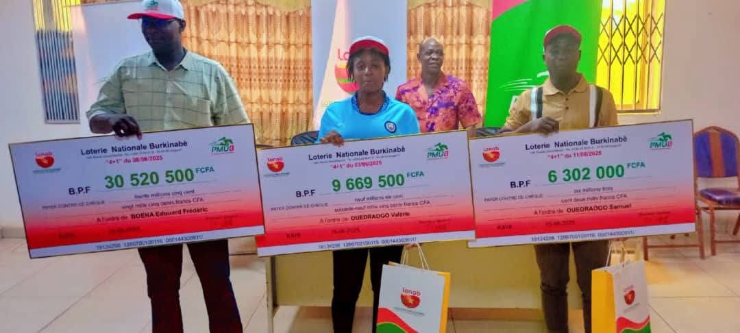 La Loterie Nationale Burkinabè a remis ce jeudi 19 juin 2025 à Kaya, province du Sanmatenga, des chèques d’un montant cumulé de plus de 46 millions F CFA à trois gagnants au 4+1 du Pari Mutuel Urbain Burkinabè. La cérémonie de remise s’est déroulée à l’agence LONAB de Kaya en présence du Directeur régional du centre, monsieur Jean ZIDA, représentant le Directeur général de la LONAB, monsieur Ibrahim Ben Harouna ZARANI.