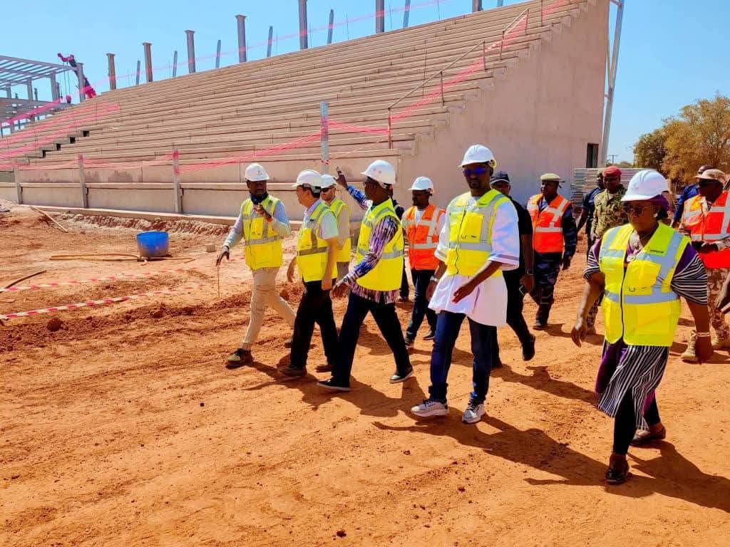 Sur le site, la délégation a constaté l’évolution des travaux au niveau de la tribune officielle, les bureaux, les gradins, les projecteurs de lumière, l’emprise du stade et l’ensemble des travaux en cours. À ce jour, les travaux réalisés par l’entreprise turque Integral Group, affiche un taux d’exécution de 72 %, et ce, conformément au calendrier établi.