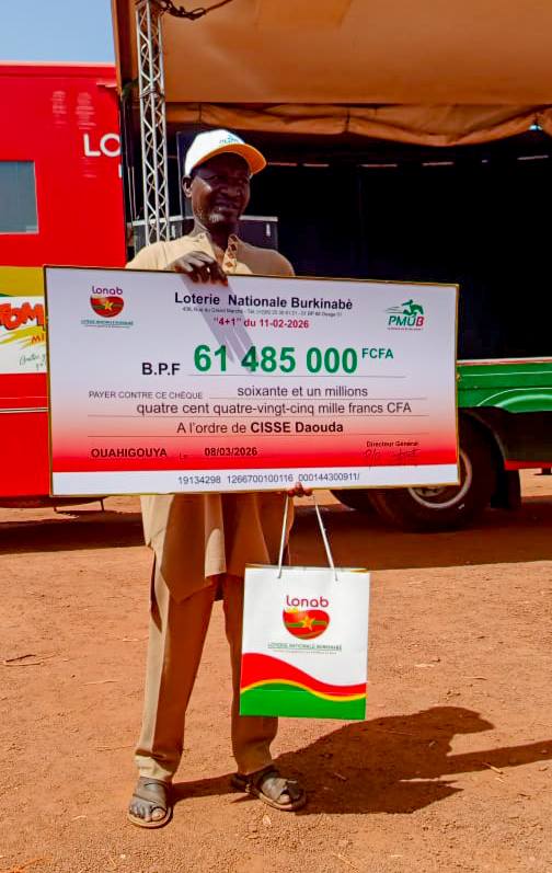 D’un montant de 61.485.000 FCFA, le gain a été décroché par Daouda Cissé, après une mise de 900 F CFA au 4+1 du 11 février 2026. L’agriculteur n’a pas caché sa joie en recevant cette somme exceptionnelle, convaincu qu’elle l’aidera à entreprendre de grandes choses pour lui et sa famille. C’est dans ce sens d’ailleurs que monsieur Zida a félicité le gagnant pour son audace et encouragé l’ensemble des parieurs à continuer de tenter leur chance.